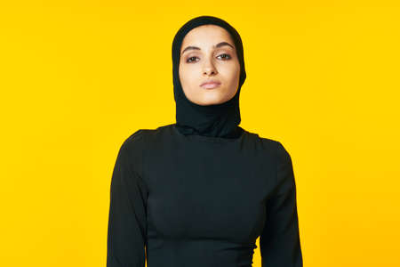 pretty woman muslim black hijab yellow background