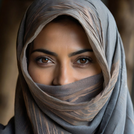 Female with dark hair, wearing a light hijab, gazes at the viewer with expressive eyes, creating a calm atmosphere against a soft, neutral backdrop