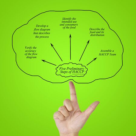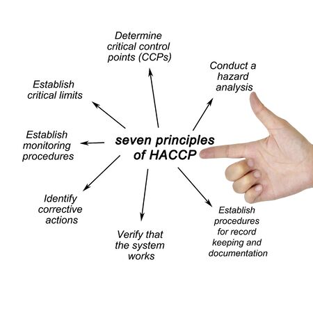 Woman hand pointing element of HACCP principle on white background for used in manufacturing.