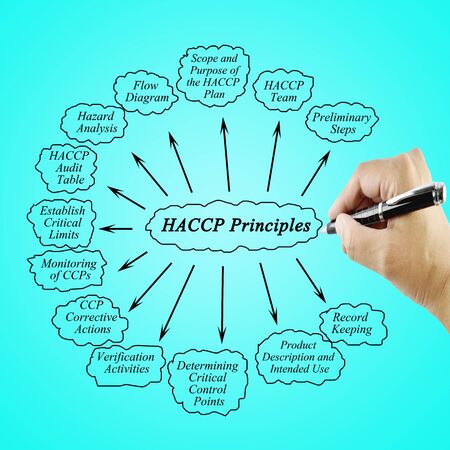 Layout about seven basic principles of HACCP plans (Hazard Analysis and Critical Control Points) - Food Safety and Quality Control in food industry concept with a descriptive scheme
