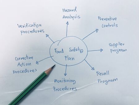 Woman hand writing element of HACCP principle on white background for used in manufacturing.