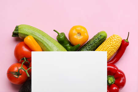 Fruits, vegetables and blank sheet of paper on color background. Vegan Day