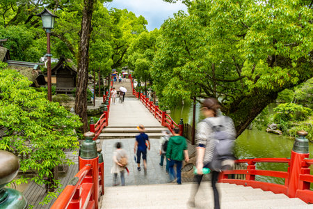 Dazaifu, Japan - 10 July 2019 - Tourists and local japanese people walk across the beautiful red bridge leading to the famous Tenmangu Shrine on July 10, 2019 in Dazaifu, Japan