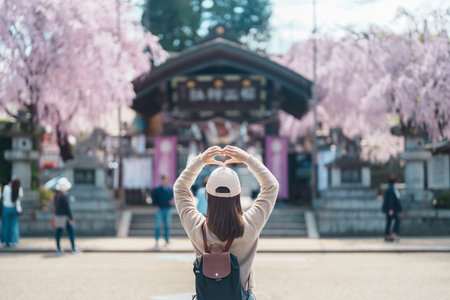 Woman tourist sightseeing Sakurayama Shrine with Cherry blossom in Spring season, happy traveler travel in Morioka city, Iwate prefecture, Japan. famous Landmark Travel and Vacation destination