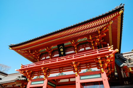 The famous heritage, traditional temple Hachiman Shrine with golden red roof against blue sky in Tokyo, Japan