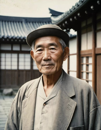 A senior man 70 years old wearing traditional Japanese clothing, showing a sense of pride and heritage in a serene courtyard with wooden buildings. An elderly resident of Japan. Generative AI.