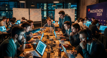 Teams at the Cybersecurity hackathon are coding intensely, strategizing in a high-energy, collaborative space, focusing on innovation.