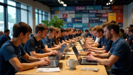 Large group of young programmers working on laptops in modern coworking space. Focused men developers in matching shirts participate in hackathon or coding competition. Tech teamwork atmosphere
