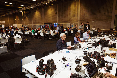 BRUSSELS, BELGIUM - Jul 12, 2018: North Atlantic Treaty Organization NATO military alliance summit in Brussels. Working moments in the summit press center