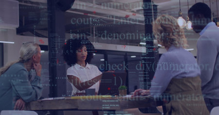 Image of diverse colleagues discussing work. Business, teamwork and digital interface concept digitally generated image.