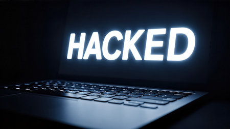 Illuminated laptop keyboard displays the word HACKED, representing the dangers of cybercrime and telephone scams in a dark, digital atmosphere