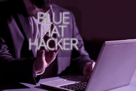 Hand writing sign Blue Hat Hacker. Business idea Person consulting firms who bug system prior to its launch Man Typing Important Data Into Laptop And Pointing New Idea With One Finger