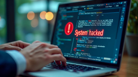 Laptop screen displaying cyber attack alert, red warning of system hacked, concept of digital security breach, internet safety issue, unauthorized access detected