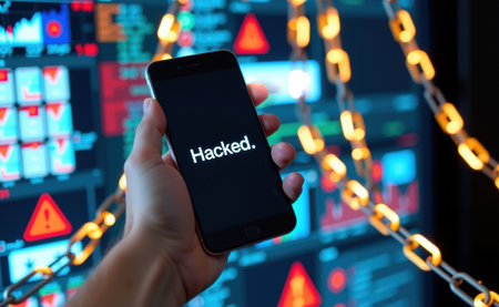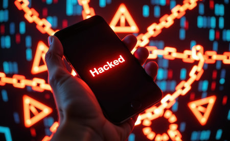A hand holds a smartphone displaying HACKED with binary code and warning signs in the background, illustrating mobile security threats.