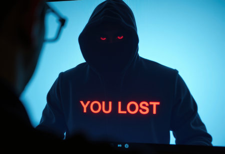 A man figure stares intently at a computer screen displaying a stark red You Lost message amidst lines of code, evoking a sense of tension and potential defeat in a cyber-security scenario.