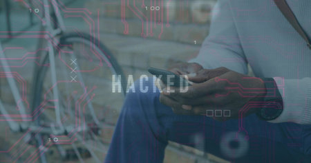 Sitting African American man tapping phone on stone steps with bike and hacked overlay, copy space. Technology, urban, modern, cybersecurity, surveillance, digital, innovation