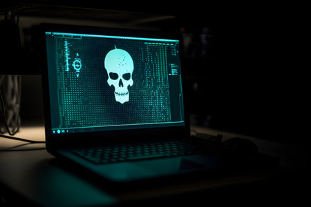 An AI generated laptop computer displaying an image of a glowing skull