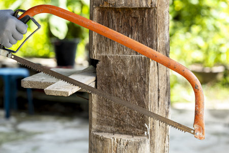 A hand saw with orange handle is being used to cut wooden post outdoors, showcasing diy woodworking project. background is blurred, highlighting focus on saw and wood