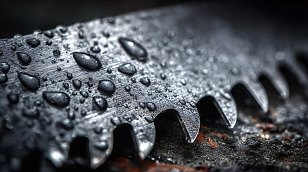 Close up macro photograph showing casing water droplets clinging to the serrated edge of a saw blade, emphasizing texture and sharpness against a dark, gritty background