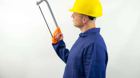 A man with a hacksaw in his hands looks in surprise at a hacksaw for metal, a builder on a white background.A young and promising employee.
