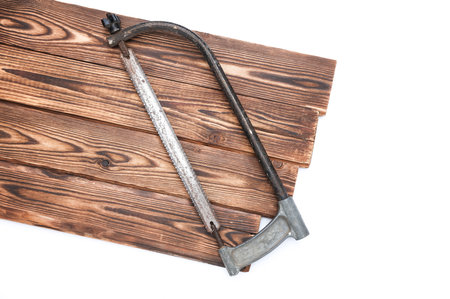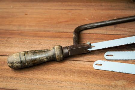 rusty Sawback for metal on the wooden background construction instruments on the wooden background