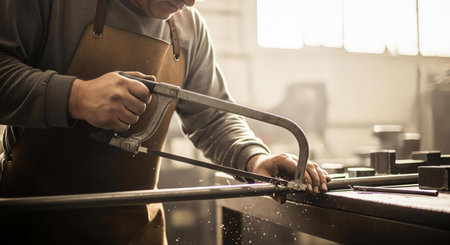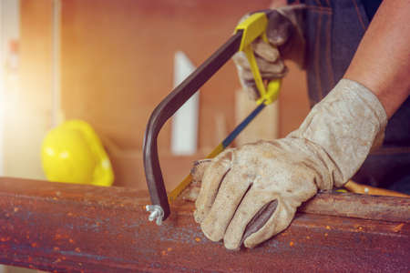 Close up of Craftsman worker sawing a steel pipe, Technician concept.