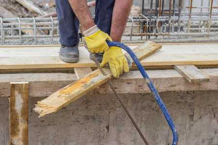 Bulder worker sawing wood board with hand saw, working on formwork installation. Selective focus and motion blur.
