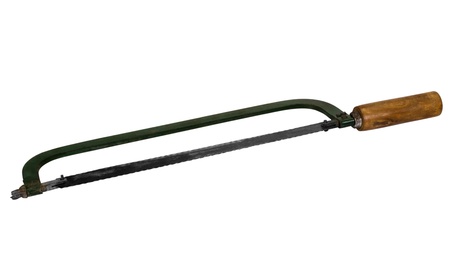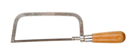 Hand holding a vintage old coping saw and cutting through a wooden block. The picture has white background.