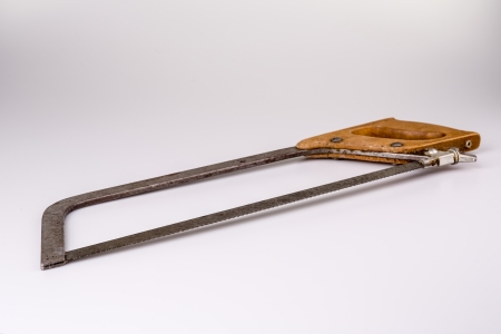 An older hand-held hacksaw with additional saw blades