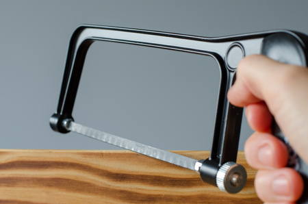 Hands are holding a hacksaw on a wooden background. The concept of repair and construction