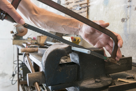 Man with saw that cutting threaded bar