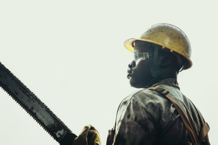 A detailed image of a man in work clothes and a yellow helmet