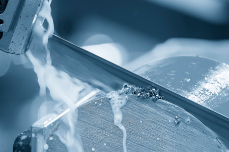Close up scene the operation of band saw cutting machine cutting the metal shaft parts with coolant method. The machine tool for industrial purpose.