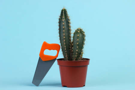 Cactus in a pot and mini saw on blue background. Garden Care Concept