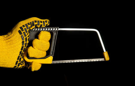 Hand builder holding a hacksaw with clipping path on black isolated background
