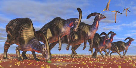 parasavrolophus on the background of other herbivorous dinosaurs