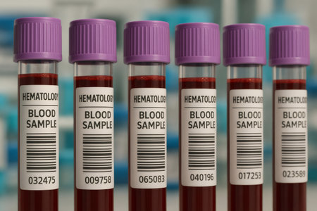 Multiple labeled blood samples in test tubes are ready for hematological analysis in a clinical laboratory setting