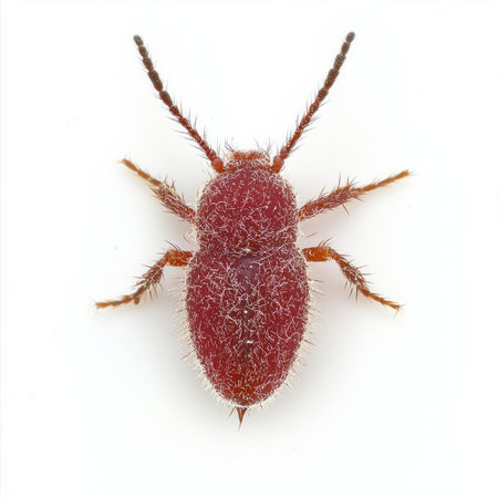 velvet mite crawls on a flat, white surface, displaying its fuzzy red body and tiny legs. This tiny creature embodies the fascinating world of microscopic life.