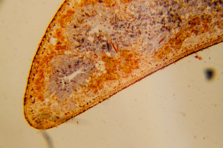 Planarian parasite (flatworm) under microscope view.