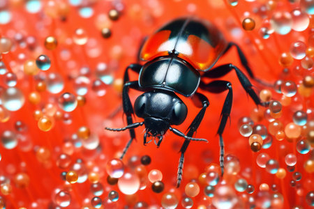 Macro shot of black ant on red flower with water drops.
