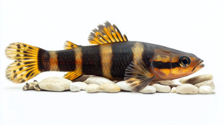 Kuhli Loach Pangio kuhlii showcases vibrant colors it glides gracefully over bed of smooth white stones highlighting unique patterns and playful demeanor in an aquarium.