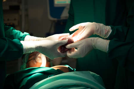 The medical team performing cesarean sections. The doctor hold the baby giving birth to his mother to see. This image was taken at AIIMS hospital, New Delhi, on March 2015.