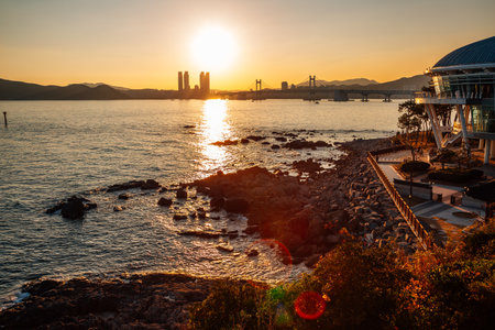 Sunset view of Gwangan bridge and sea at Haeundae Dongbaekseom island in Busan, Korea