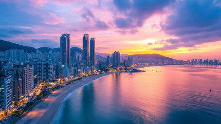 Busan, South Korea - April 2019: Cityscape with illuminated lights on buildings during sunset along Gwangalli Beach, a popular tourist destination in Busan, South Korea