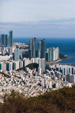 Skyline of Busan viewed behind Igidae peninsula, Republic of Korea