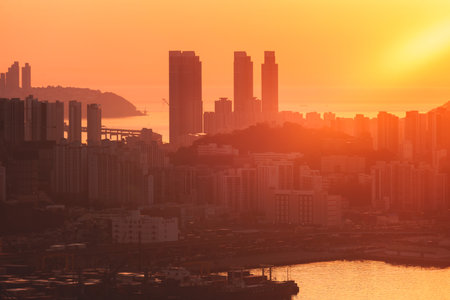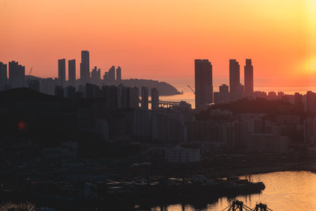 Busan sunset city panorama, beautiful skyline view with high-rise buildings skyscrapers at dawn, Busan port daybreak, cityscape with harbor bay, South Korea, Yeongnam district, sunny day