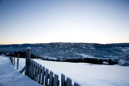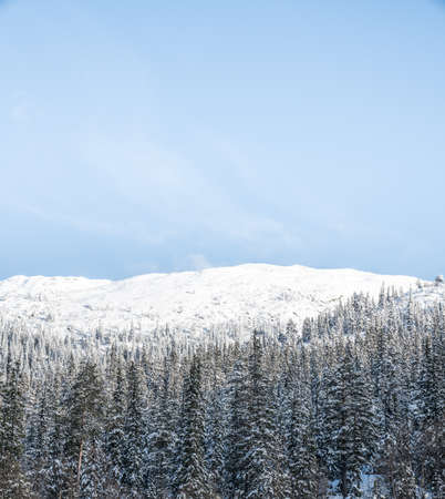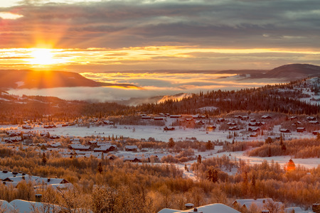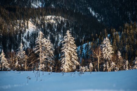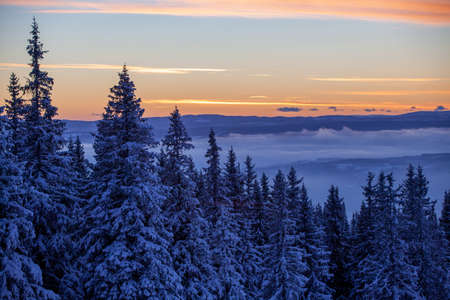 Sunrise, sunset picture in winter, in Scandinavia. Snowie mountains and trees. Travel photography, copy space.