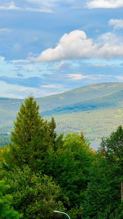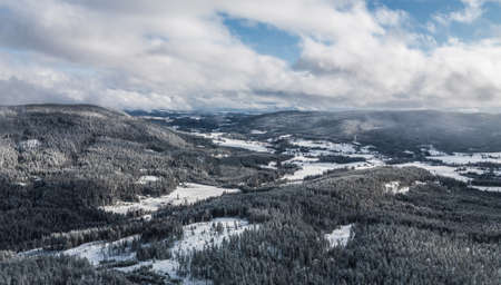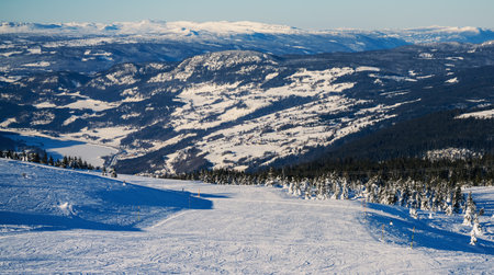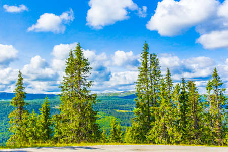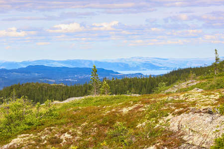 Beautiful landscape panorama of Norway FÃ¥vang Kvitfjell Ski area with Mountains forest nature and cloudy blue sky.