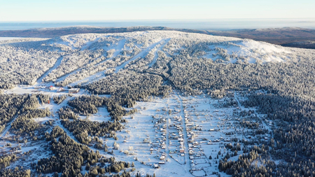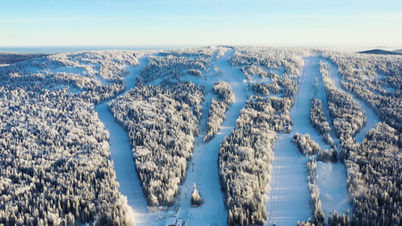 Panoramic top view of ski resort. Footage. Beautiful winter landscape of ski resort in forest mountainous area. Outdoor activities in winter.