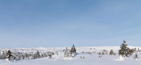 Winter mountain landscape with blue sky and snowy trees. Silesian Beskids, Poland.